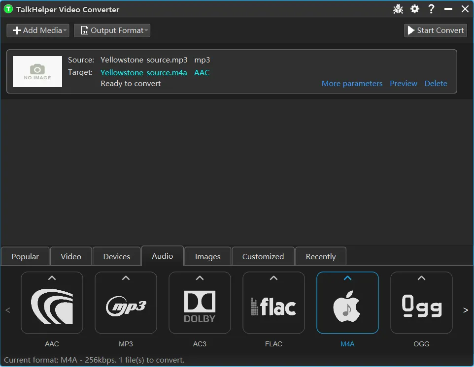 TalkHelper Video Converter is the best MP3 to M4A converter you can get and guarantee a smooth workflow without limitations. This audio converter thrives on striking the perfect balance between the output quality and file size. Specifically, you will get a smaller M4A file compared to the original MP3 file and still keep the original audio quality intact.